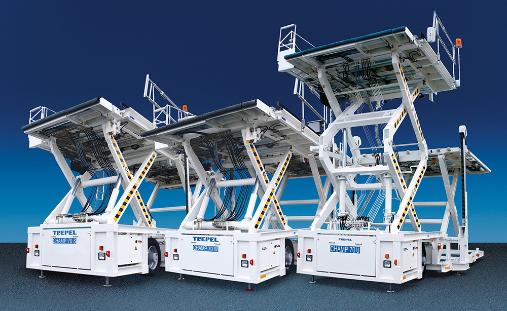 The CHAMP 70 range, TREPEL’s 7 ton cargo high loaders, combines highest availability with extremely low operation and maintenance costs, making this versatile pallet and container high loader a real CHAMP. Fast lifting speed as well as accurate freight transfer under all climatic conditions are true operational advantages. The design of the CHAMP 70 offers maximum safety for operating personnel, aircraft and loader. Freight handling at a higher level.